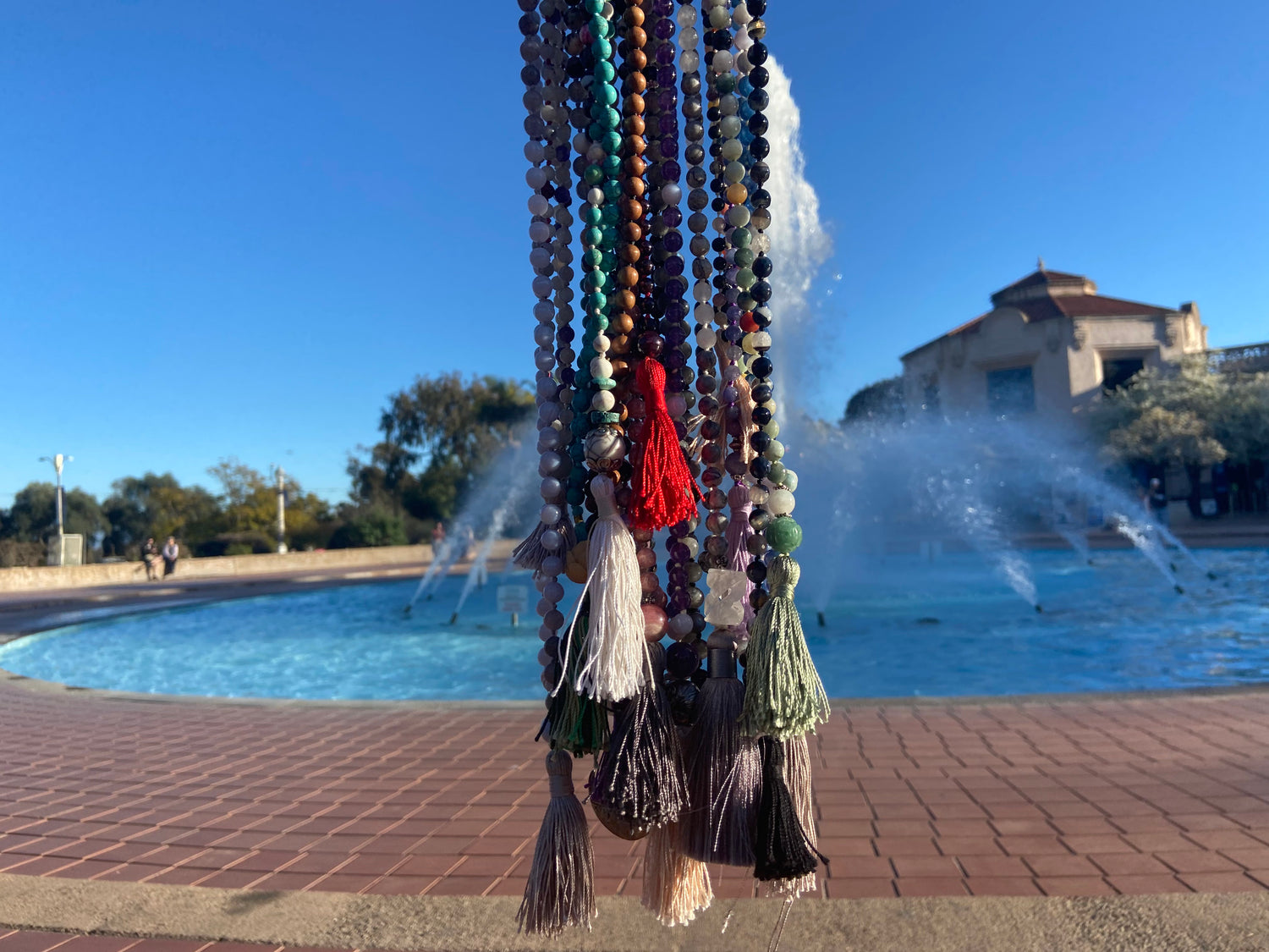 This mala is a unique, one-of-a-kind necklace handmade with 108 Amazonite gemstone beads and knots between each bead, a guru bead and a tassel.